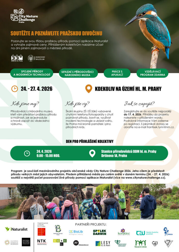 Věděli jste, že i uprostřed velkoměsta žije překvapivé množství rostlin, živočichů a hub? Přijďte je s námi objevovat a staňte se na chvíli vědci! Mezinárodní projekt City Nature Challenge se vrací do Prahy a zve školní kolektivy i jednotlivce k účasti na jedinečné akci, která propojuje přírodu, moderní technologie a zábavu.
